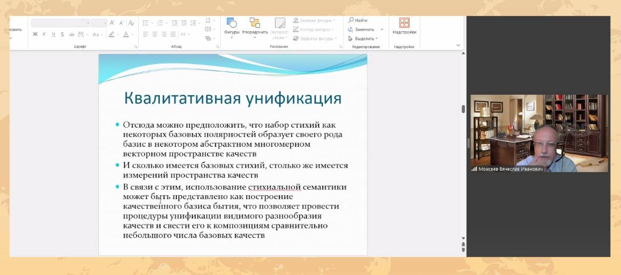Следующим докладчиком стал Вячеслав Иванович Моисеев, доктор философских наук, профессор и заведующий кафедрой философии, биомедицинской этики и гуманитарных наук МГМСУ им. А. Е. Евдокимова, сотрудник ИФ РАН. Тема доклада: «К теоретическим основаниям схемы У-син пяти первоэлементов»