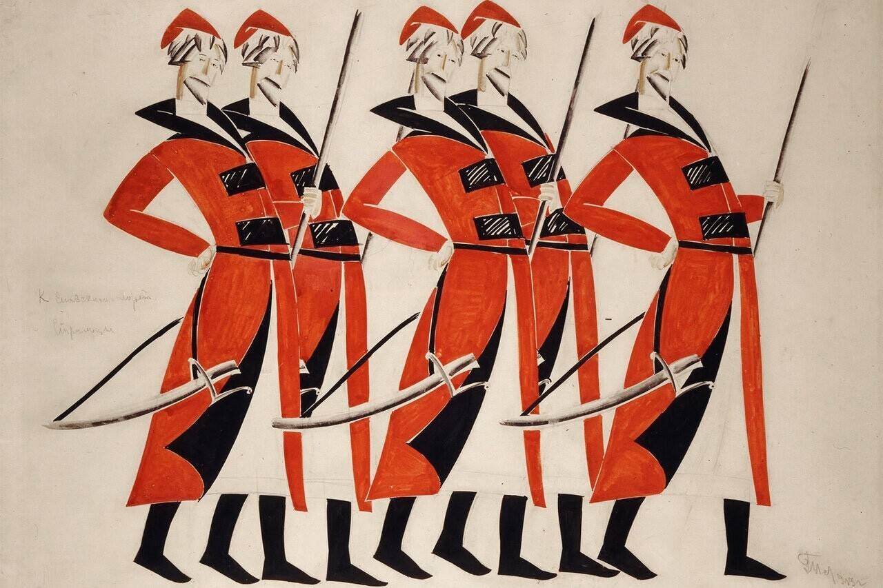 Владимир Татлин заявил себе, как сценограф. На выставке можно увидеть эскизы его декораций и костюмы к опере Михаила Глинки «Жизнь за царя». Смесь кубизма с иконописью – это было ново и дерзко. Интенсивные краски соседствовуют с приглушёнными, а схематично нарисованный лес таит в себе мистику, будто бы там обитают языческие боги. К сожалению, постановка не осуществилась. Имелись у Татлина и успешные проекты. Он любил театр, понимая его суть. Нереальная реальность должна затягивать зрителя, превращая его в соучастника действа.