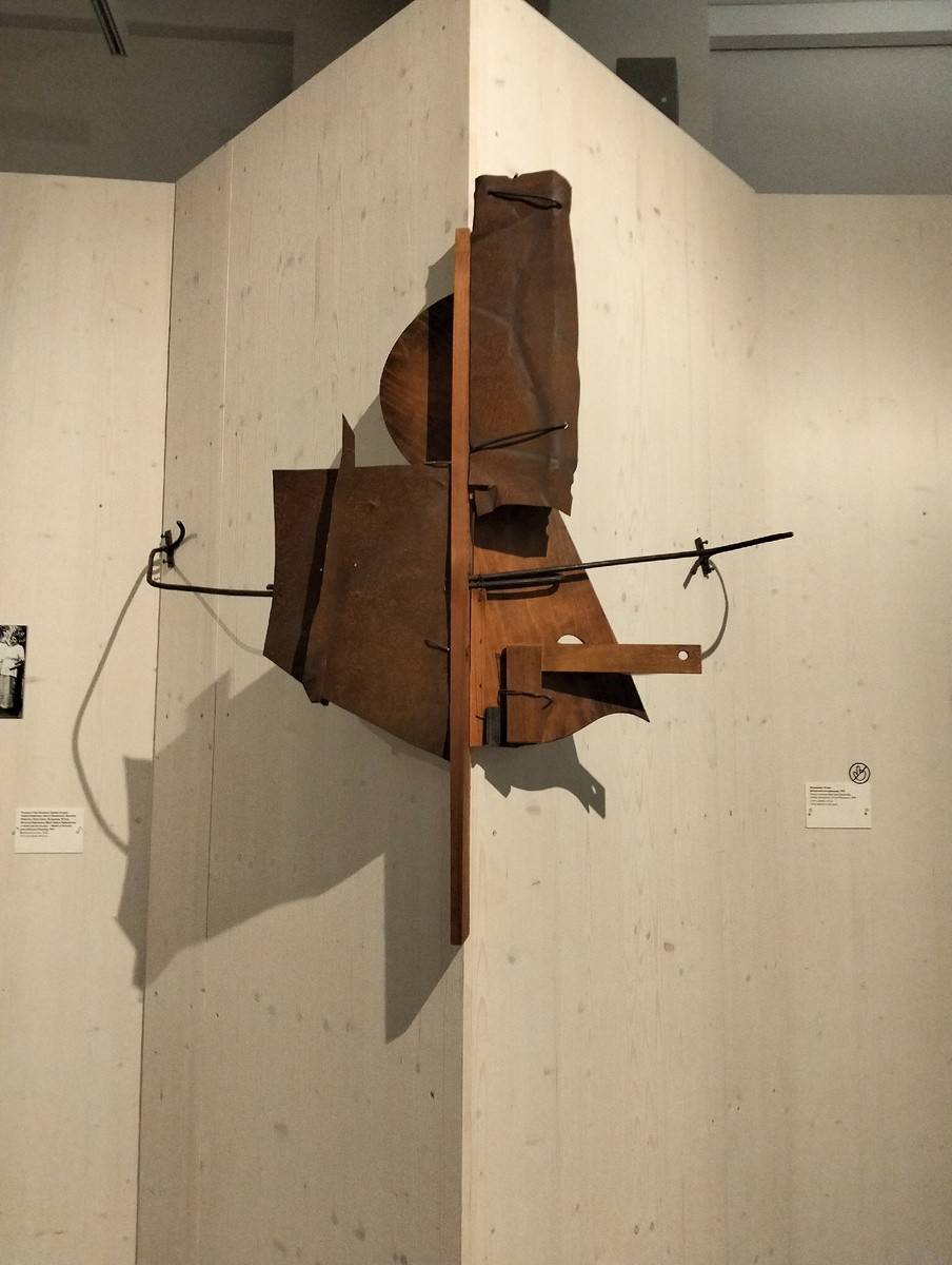 Среди экспонатов – так называемые контррельефы, изобретённые Владимиром Татлиным для выявления свойств материала. То были умозрительные конструкции, не изображавшие предметов. Для контррельефов мастер использовал дерево, металл, стекло, верёвки. Татлин выстаивал антитезы: объём – плоскость, шероховатость – гладкость, динамика – статика. Эту концепцию впоследствии подхватили конструктивисты в стремлении познать форму и содержание.