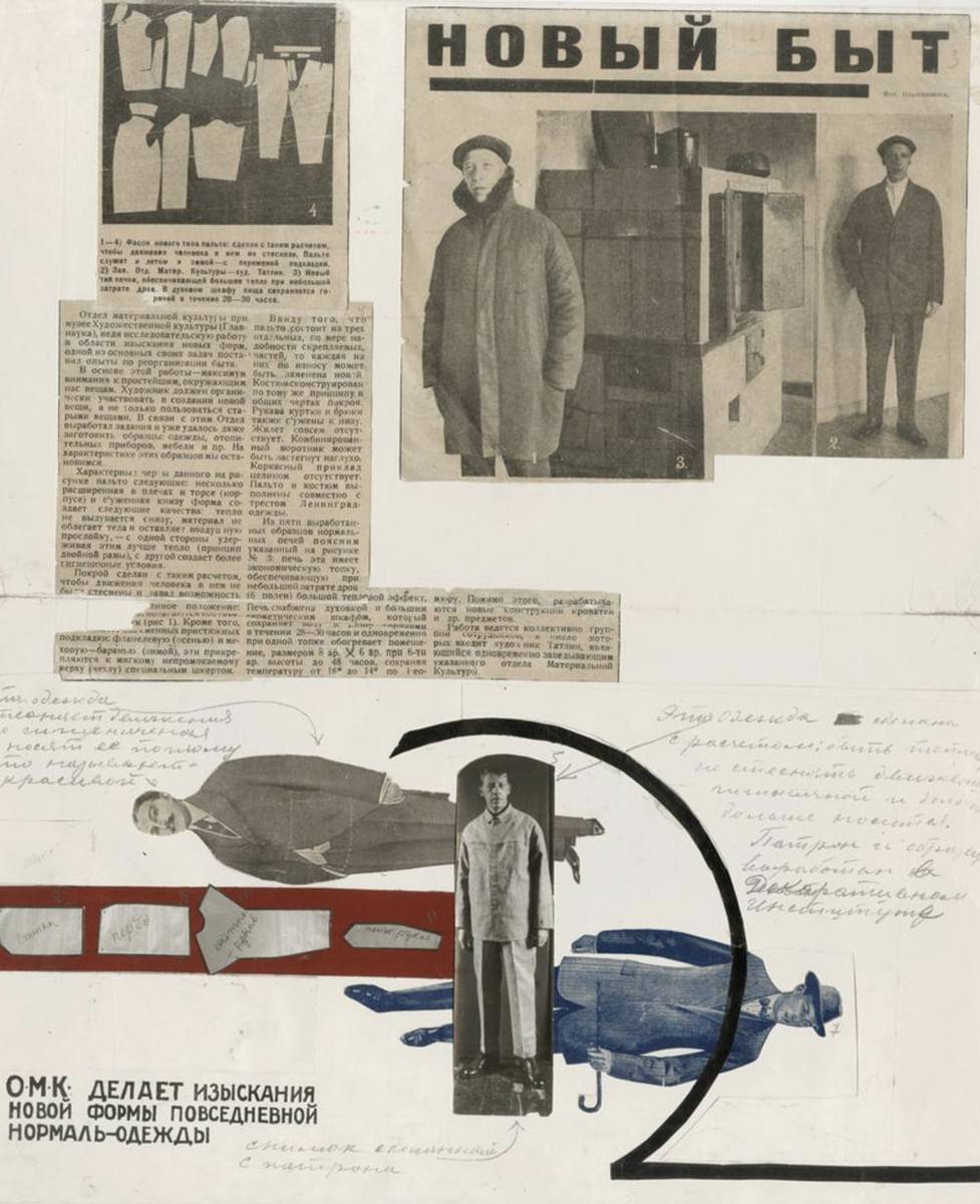 Коснулось это и одежды. Считалось, что облачение сознательного пролетария, как и рационалистическая архитектура дома или фабрики-кухни, должна состоять из утилитарно-конструктивных элементов. Никаких потайных кармашков и бесполезных хлястиков, а тем более – рюшей. Варвара Степанова, жена и соратница Александра Родченко утверждала: «Мода, психологически отражавшая быт, привычки, эстетический вкус, уступает место одежде организованной для работы в различных отраслях труда, для определенного социального действия, одежде, которую можно показать только в процессе работы в ней, вне реальной жизни не представляющей из себя самодовлеющей ценности, особого вида произведений искусства. Витрины магазинов с выставленными в них моделями костюмов на восковых манекенах, становятся эстетическим пережитком. Сегодняшний костюм надо смотреть в действии, вне его нет костюма так же, как бессмысленна машина вне работы ею производимой».