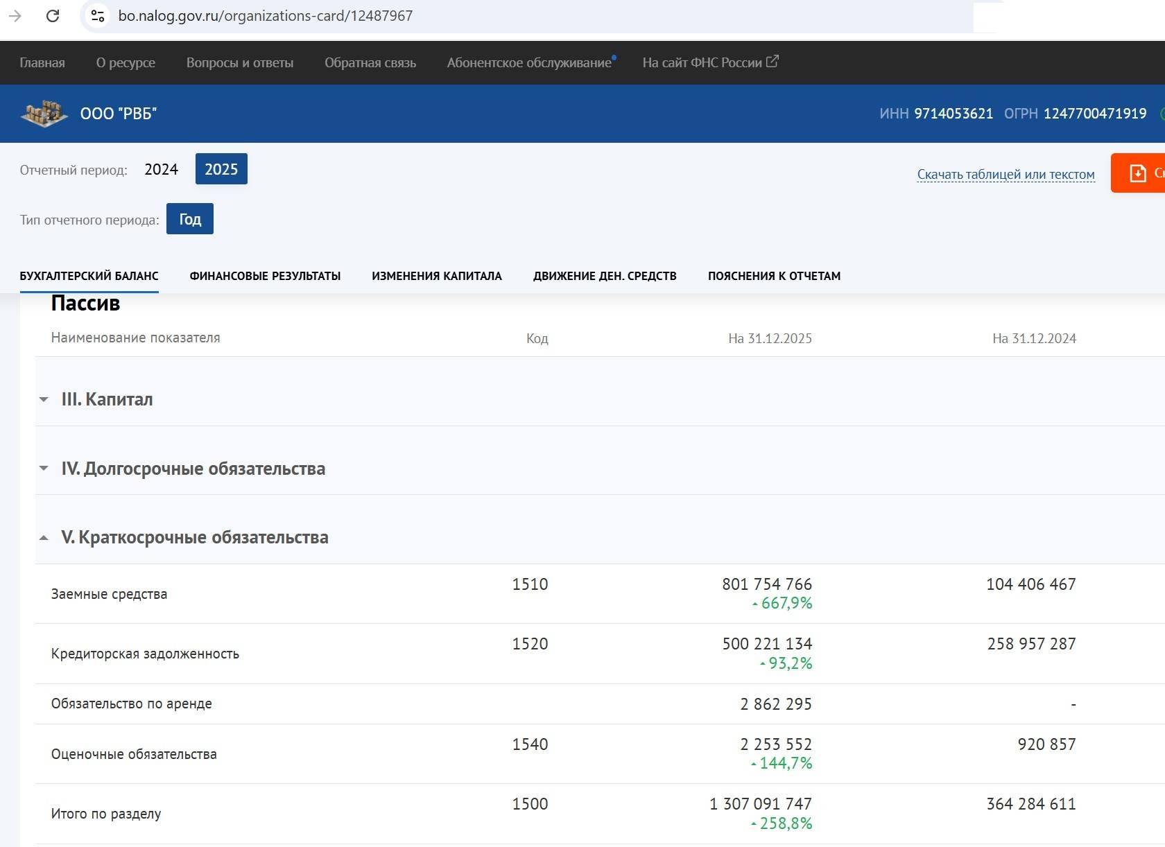 Теперь попробуем разобраться с отчётностью «Вайлдберриз». Подобное было сделано ранее в заметке «Озон» и «Почта России»: что позволено Юпитеру и не позволено быку» в марте 2026 года, с выводами про «убытки, лазейки в налогах и банковском регулировании «Озона». «Вайлдберриз» не публикует подробную отчётность, и она доступна только на сайте ФНС; к тому же операции были переведены в 2024 году на новое юрлицо — ООО «РВБ».