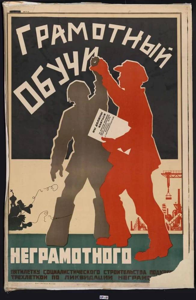 Одна из самых первейших задач Советской Власти - война с неграмотностью. Конечно, Россия не слыла тотально отсталой и убого-лапотной, и, вместе с тем, процент образованного населения был невысок, как и в других странах. «Грамотный, обучи неграмотного!» - призывал плакат, и пропаганда шла даже на уровне цветовосприятия – рабочий с книгой рисовался алого цвета, а сирый крестьянин считывался, как серый. Горящим красным победим серость!