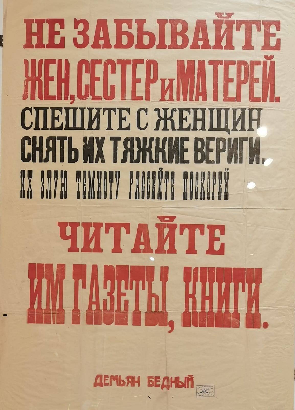 Звенит пафосом плакат со стихами Демьяна Бедного: «Не забывайте жён, сестер и матерей, / Спешите с женщин снять их тяжкие вериги, / Их злую темноту рассейте поскорей, / Читайте им газеты, книги». При всей патетике, вещь забавная – куда как проще научить тех жён читать, дабы они сами постигали строки, в том числе Демьяна Бедного.