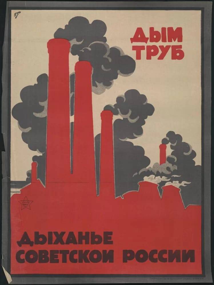 Уникален плакат «Дым труб – дыхание Советской России», выполненный в Германии. До 1933 года наблюдалось теснейшее сотрудничество СССР и Веймарской Республики, а представители немецких коммунистов и «левых» сил часто приезжали в Москву. Более того, в Берлине и других крупных городах имелись рабочие театры, копировавшие манеру «Синей блузы». У немецких комми была своя эстетика, напоминавшая раннесоветскую – лапидарность, броскость, лозунговый стиль. Знаменитый Баухаус и его лидер Вальтер Гропиус тоже сотрудничал с нашими творцами. Поэтому «Дым труб…» не выпадает из общего ряда и смотрится, как нечто родное.