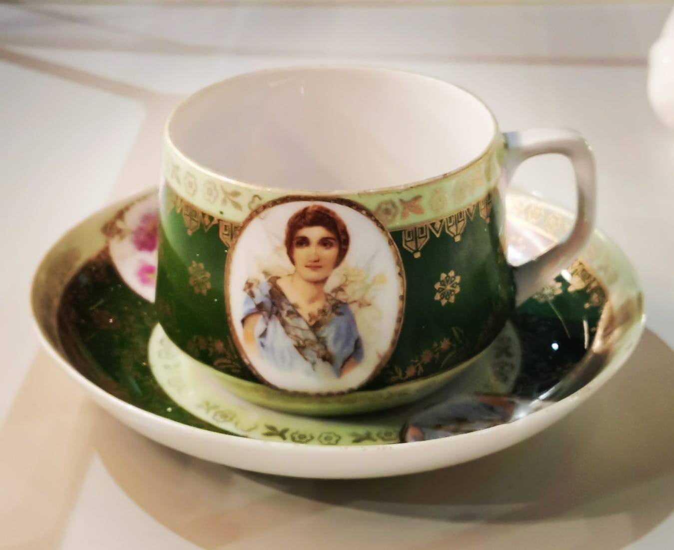 Тут же – сервиз «Долой неграмотность!» с росписями выдающегося мастера Сергея Чехонина. Справедливости ради, такие рисунки пользовались куда как меньшим спросом у населения, чем розы да богини. Самолёты-пароходы на блюдцах - волшебны, как произведения искусства и веяние времени, а не в качестве повседневных вещиц. Уже в 1930-х деятели поняли, что плакат хорош на стене, а не в виде узора на чайнике.
