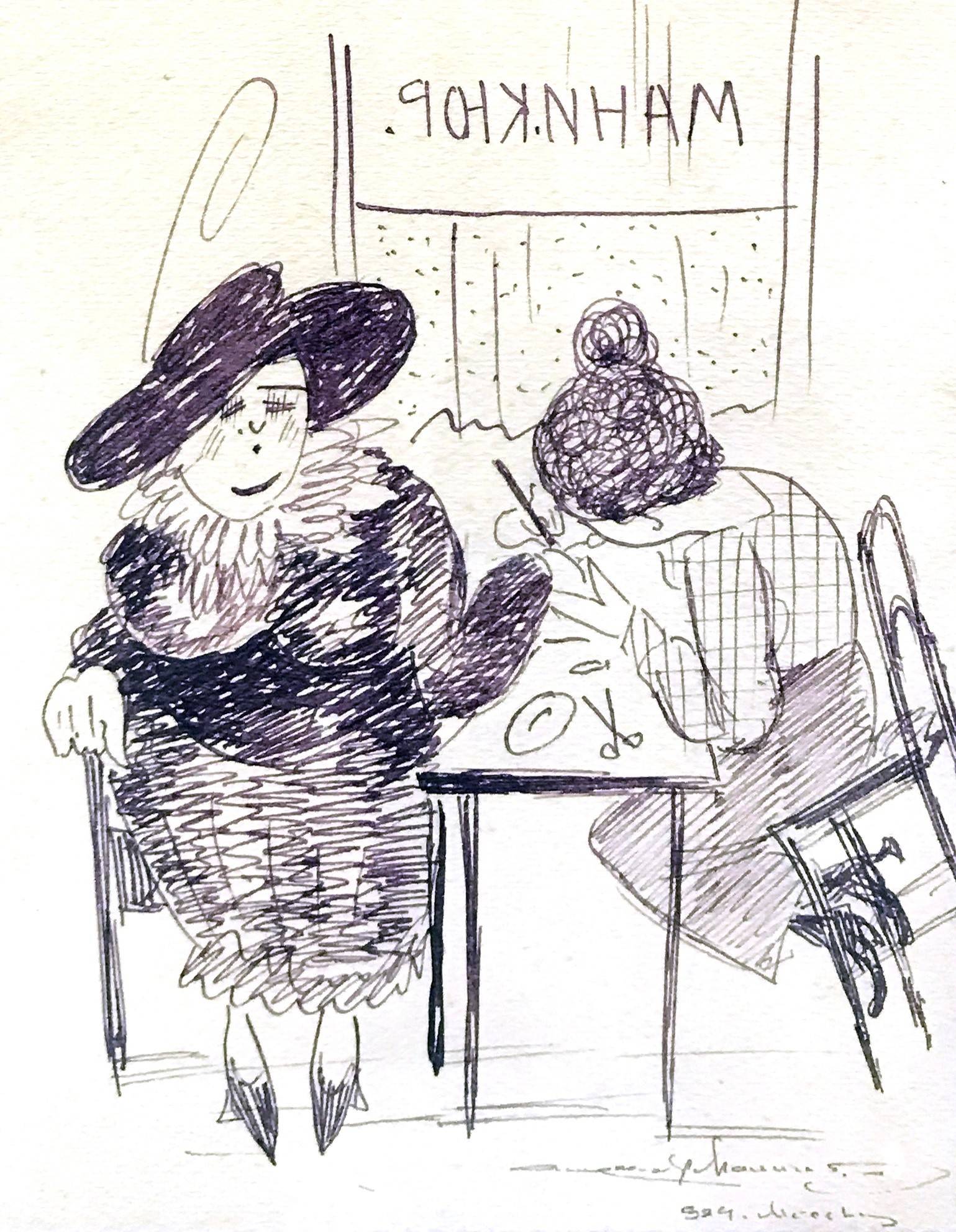1920-е годы – бум карикатур. Выходил не только известный нам «Крокодил», но и «Смехач», «Красный перец», «Бегемот», «Ревизор». Печатались карикатуры и в вышеупомянутом «Безбожнике у станка». Такого количества сатиры и юмора не было ни до, ни после. На одном из стендов – серия рисунков Александра Малишевского – уличная толчея, ларьки, обыватели. А тут – маникюрный кабинет и старательная мастерица делает маникюр толстой, апатичной нэпманше.
