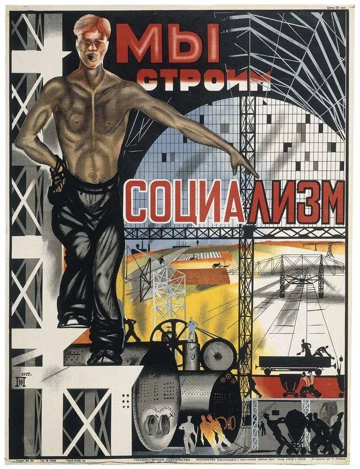 Кстати, о плакатах! Здесь их превеликое множество. Сработано бодро и талантливо. Создатели были воодушевлены всем происходящим – слогом, ритмом, боем, форматом. «Мы строим социализм!» - восклицают персонажи плаката, созданного Юрием Пименовым. Гигантский рабочий указывает на производственные мощности, на крутящиеся колёса, грузящиеся вагонетки угля и возводящиеся мосты. Изумительно точная композиция, где все детали подчинены гармонии, а все резкие движения смотрятся, как слаженный танец. Танец машин!