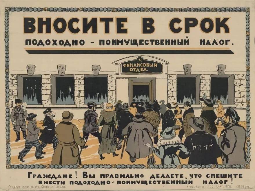 В 1920-х годах к рекламе относились, как к существенному фактору и как к искусству, а посему нередки были рифмованные строки: «Вносите в срок подоходно-поимущественный налог». Это не Владимир Маяковский, а неизвестный нам автор, но стиль тот же, что и у «агитатора-горлана-главаря». Тут же нарисованы граждане, спешащие в финотдел. Собственно, образ фининспектора являлся одним из ведущих в сатирической и остросоциальной литературе тех лет.