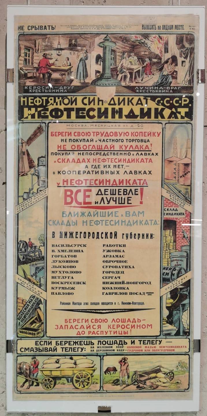 На стенах – рекламные слоганы, которых в 1920-х годах было так же много, как и доходчивой пропаганды. Замечателен плакат Нефтесиндиката, внешнеторговой организации по сбыту нефти и нефтепродуктов. Его организовали в июле 1922 года для централизованного проведения операций, связанных с закупкой нефтепродуктов у советских нефтяных трестов и реализации их на внешних рынках. Этот плакат был обращён к сельскому населению, и потому красочные картинки дополнялись воззваниями: «Керосин – друг крестьянина» и «Береги свою лошадь – запасайся керосином до распутицы». Кроме того, призывали не покупать у кулака и частника, а идти прямиком в лавки Нефтесиндиката.