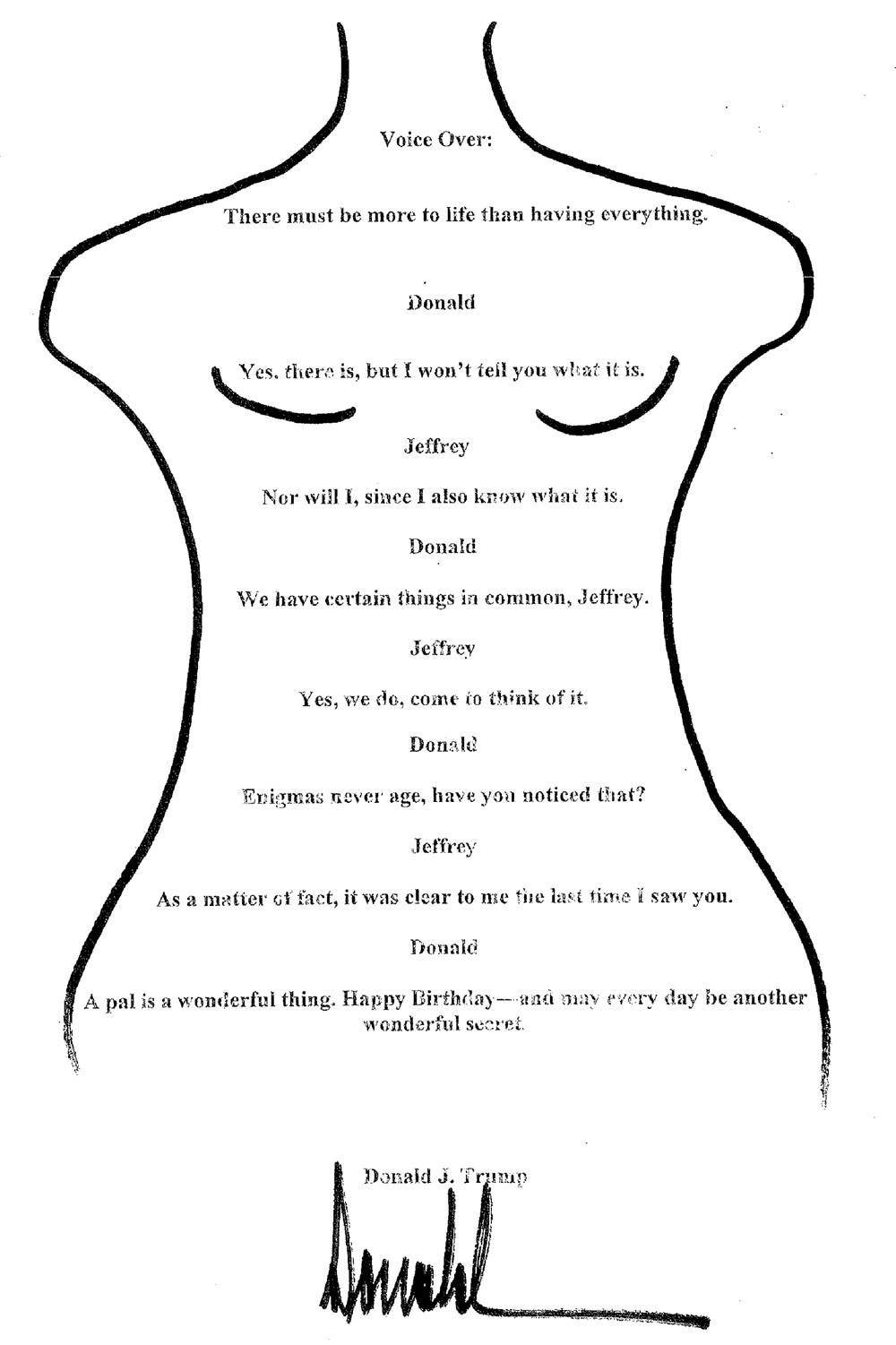 Было бы сложно с абсолютной уверенностью доказать, что Трамп написал письмо с поздравлением. Но его отрицания не выдерживают никакой критики. В письме приводится странный воображаемый диалог между Трампом и Эпштейном, напечатанный внутри контура женского тела. Сразу после публикации статьи Трамп заявил: «Я в жизни не нарисовал ни одной картинки» и «Я не рисую картинки». За исключением того, что он явно рисовал картинки в рассматриваемый период. Позже в том же месяце он сказал, что «кто-то мог написать письмо и использовать моё имя». Но затем в его иске против материнской компании The Journal утверждалось, что письма не существовало, и оно называлось «несуществующее письмо». Теперь известно, что письмо не только существовало, но и находилось в имуществе Эпштейна. Это явно указывает на то, что это не просто подделка, созданная недавно, чтобы выставить Трампа в плохом свете. Это то, что было у Эпштейна. И наконец, вскоре после того, как 8 сентября было опубликовано фото письма, Белый дом заявил, что подпись настолько отличается от подписи Трампа, что это явно не его почерк. За исключением того, что она очень похожа на его подписи на личных письмах того же периода. Трампа не обвиняют в каких-либо правонарушениях, связанных с Эпштейном. Но он неоднократно делал ложные заявления об осуждённом за сексуальные преступления и о своих отношениях с ним, из-за чего его натянутые опровержения по поводу письма становится всё труднее воспринимать всерьёз.