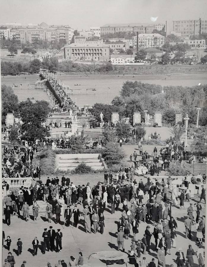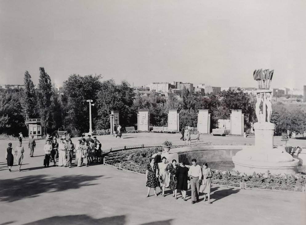 А тут – роскошнейшие виды парка отдыха имени Александра Щербакова - первого секретаря Донецкого обкома партии в 1938 году. Кстати, метро Алексеевская в Москве долгое время носила имя Щербаковская – и тоже в честь этого деятеля. Парк был создан в так называемой Скоморошиной балке, которая с XIX века служила местом гуляний у рабочих юзовского металлургического завода и близлежащих шахт. При советской власти произошло окультуривание городской среды, как делалось это во всём Советском Союзе. Мы видим и клумбы, и античных нимф, и тополя с акациями, и, разумеется, нарядных граждан.