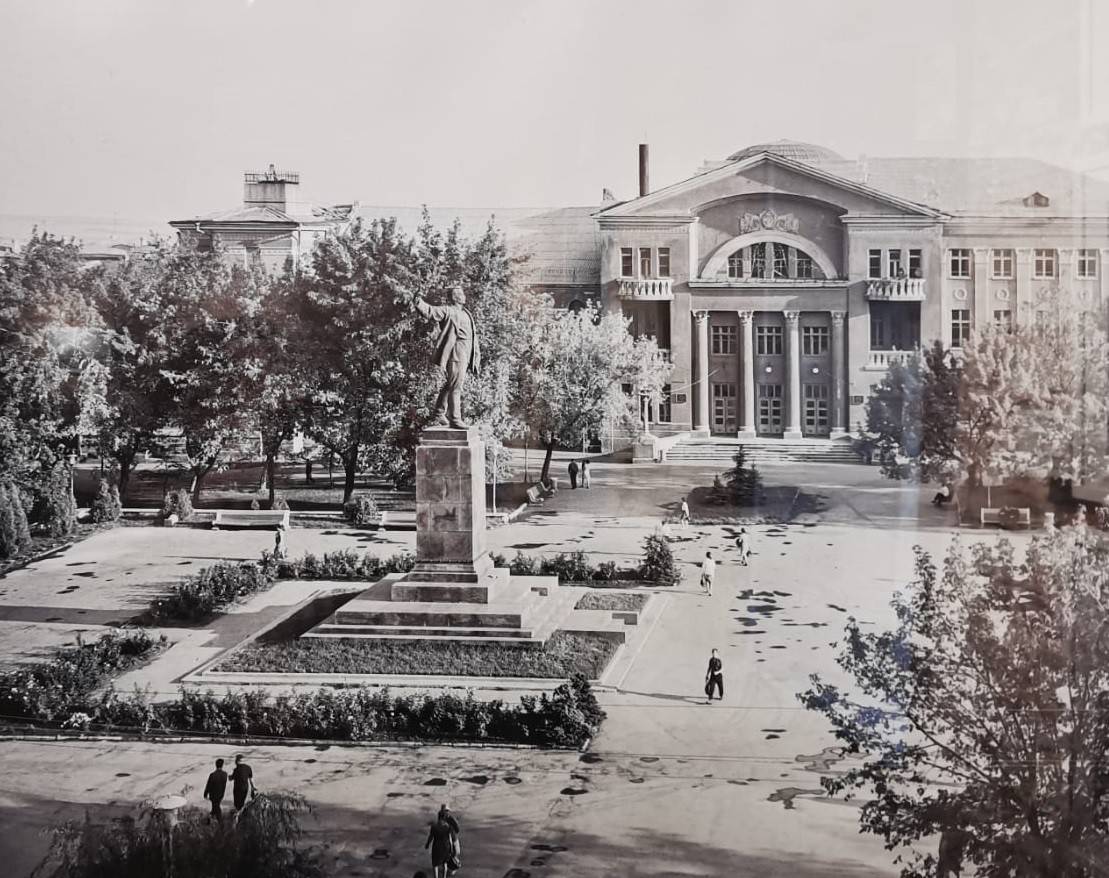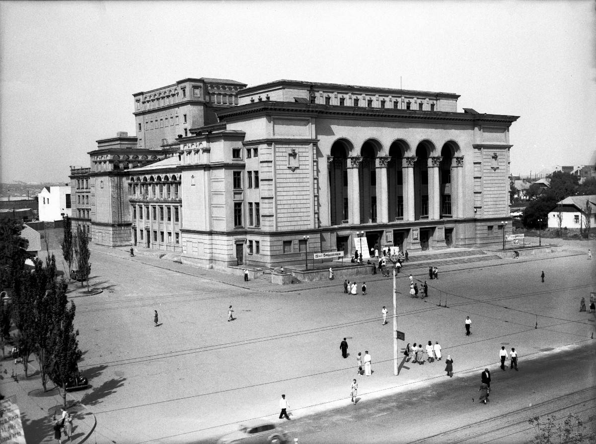 Вот – театр оперы и балета имени А. Соловьяненко, открытый накануне войны – 12 апреля 1941 года. Музыкальные подмостки существовали в Юзовке ещё до революции – так называемая «передвижная опера», а это – новое здание, возведённое, согласно плану реконструкции города. Хоромы в духе итальянского Ренессанса – с колоннами, гулкими пролётами и грандиозным залом - было выстроено одесским архитектором Людвигом Котовским, крупнейшим зодчим Малороссии. Фотограф нашёл идеальную точку съёмки – такую, откуда видны все линии постройки.