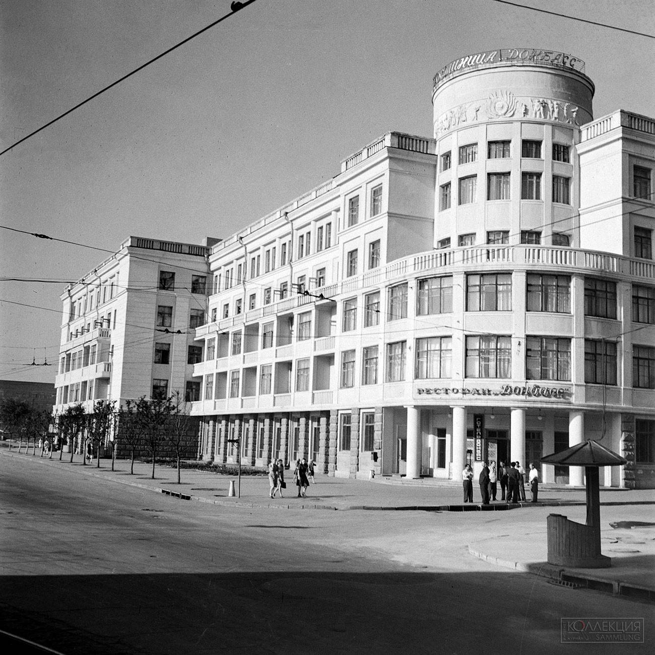 Эркер, квадратные окна, лапидарный силуэт и тут же – греко-римская декоративность, символизировавшая верность античному наследию. Отель «Донбасс» был настоящей архитектурной жемчужиной и часто попадал на видовые открытки. Во время оккупации в этом здании размещалось гестапо, а эти сволочи всегда выбирали лучшие помещения, отодвигая даже армейские штабы. Халдей сосредоточился на эркере, как на самой выразительной детали, и гостиница напоминает корабль, бороздящий воображаемые океаны.
