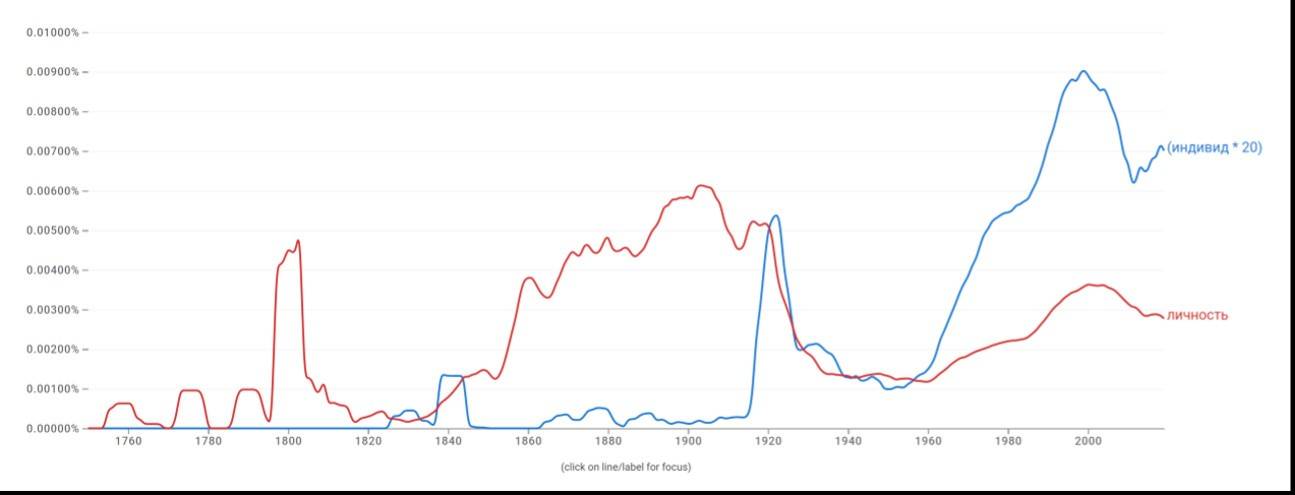 До XX века в России слово «индивид» почти не употреблялось; чаще говорили «личность». Слово «индивид» распространилось вместе с распространением переводной литературы; кроме того, оно более конкретно указывает на «особливость» данного человека, чем «личность». Личность может быть и «темная», и «светлая», и «подозрительная», а индивид конкретно индивидуален. Интересен пик «личности» в районе 1800 года, думаю, он связан со славой личности Наполеона, пробудившей надежды на подъём других личностей, а обвал пика — с его вторжением в Россию.