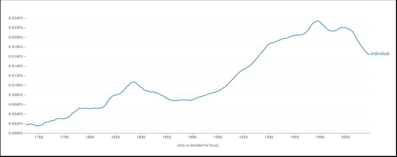 Вот график частоты использования слова individual в книгах, изданных на английском языке с 1750 по 2019 год (по данным Google Books Ngram Viewer):