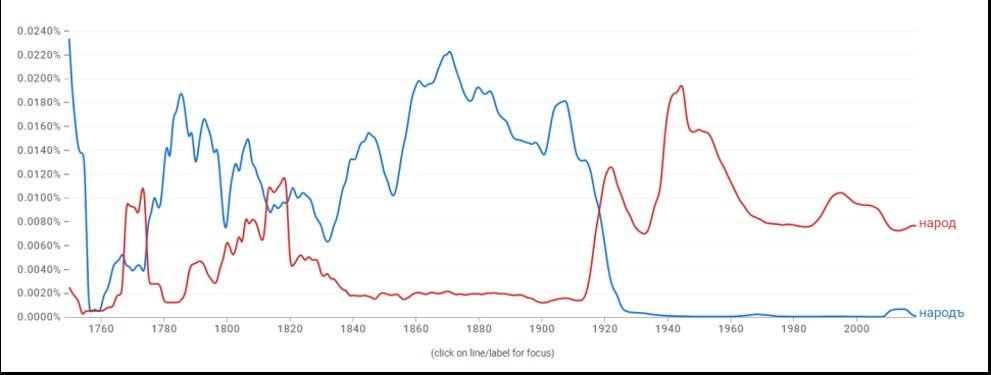 Вот еще одна замечательная картинка (частота употребления слова «народ», до реформы орфографии 1918 года — «народъ»; трудно сказать, откуда довольно часто встречающийся «народ» без «ъ» до революции — или ошибки типографов, или ошибки Гугла при оцифровке):