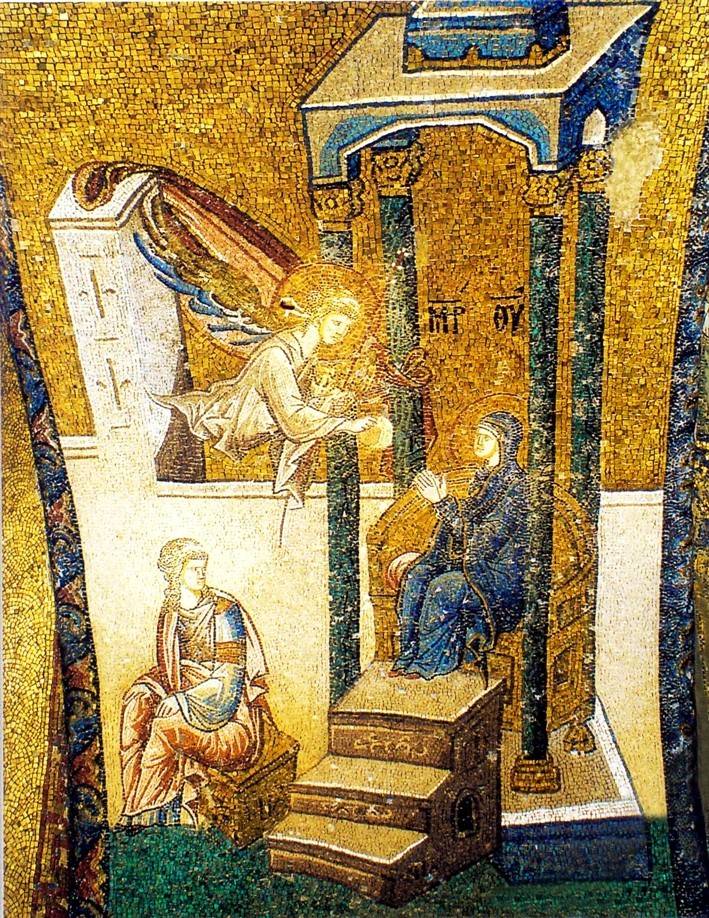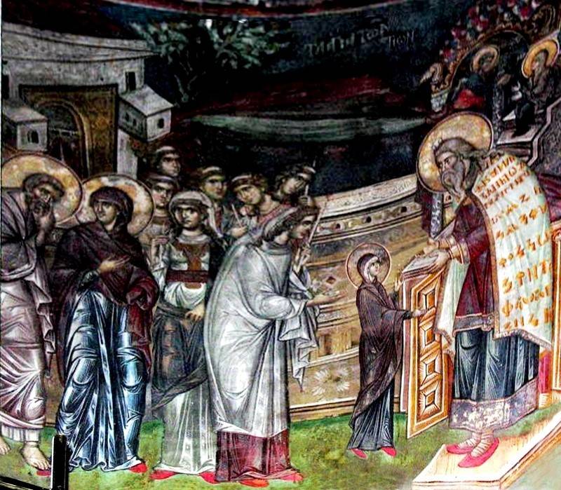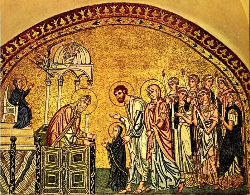 Но посвящается Приснодева Мария в служительницы Божии, как считает Н.П.Кондаков, именно Введением Ее во Храм. Об этом свидетельствуют настенные росписи и мозаики в православных храмах византийского мира.