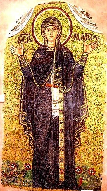 12, 13. Одна из последних мозаичных икон Богоматери-Диакониссы (XI в.) из апсиды разрушенной базилики Урсиана в Равенне сейчас находится в местном музее. Белый орарь, ниспадающий с шеи, впоследствии превратился просто в белый платочек, довольно узкий и длинный, закрепленный на поясе, как, например, на мозаичной иконе Богородицы Оранты в апсиде Софии Киевской – точно по слову Н.П.Кондакова.