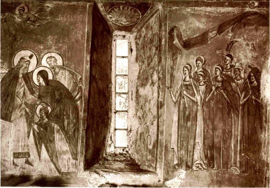 34. Интересно, что переходный вариант от одного типа композиции к другому сохранился на стене собора Рождества Богородицы Снетогорского монастыря под Псковом (1313 г.), где Младеница Мария изображена дважды: сначала Она еще только отошла на шаг от родителей и направляется в сторону первосвященника, а затем Она уже у входа в Храм, причем Ее направляет, оберегает и передает с рук на руки Захарии уже не мать Анна, как на волотовской фреске, но одна из дщерей иерусалимских – или, опять же, ангел?