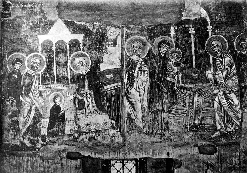 (К сожалению, сохранность этой фресковой композиции не очень хорошая, но белый плат на главе Марии – причем такой же, как плащ на плечах первосвященника, – со стилизованными еврейскими буквами – виден очень четко).
