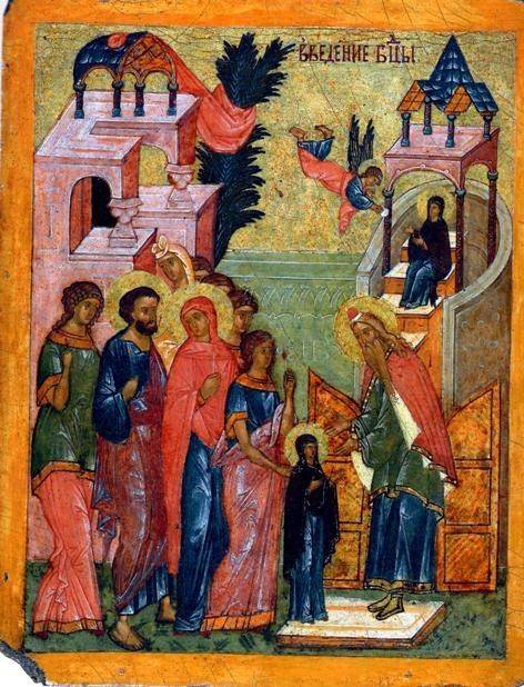 Таким образом, праздник Введения Богородицы во Храм есть приглашение каждой душе христианской войти с Нею во Храм Божий – Церковь и так же, как Она, принять в себя Христа, соединиться с Ним во святой Евхаристии и радоваться с Ним и со всеми святыми во светлом Его Царствии. Наглядной иллюстрацией этой мысли служит каждая икона этого праздника.