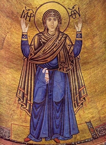 Н.П.Кондаков особо указывает, что размещение иконы Богородицы Оранты в конхе апсиды – самом святом месте христианского храма – напоминало молящимся о том, что с детства Она как Служительница Божия и посвященная Богу Дева пребывала во Святом Святых Иерусалимского Храма. И с тех пор Пресвятая Дева представляется как служительница Сына Своего Спасителя Христа.