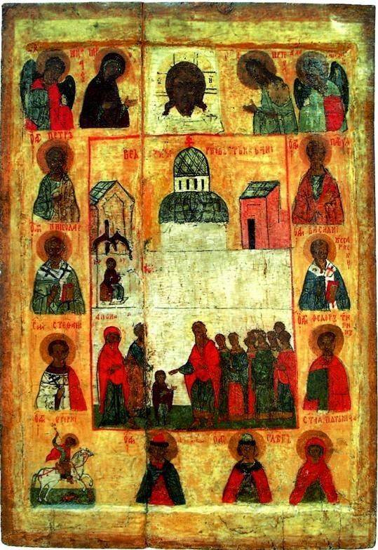 Удивительно: храм на иконе XVI в., написанной на Русском Севере, представляет собою двухъярусную ротонду Анастасис (с «плечиками»), построенную в IV в. при св. императоре Константине над Гробом Христовым так же, как на иконе в составе эпистилия XII в. в Синайском монастыре. Но по этой же схеме в Константинополе был построен храмовый комплекс во Влахернах: как мы уже упоминали, это базиликальный Большой храм, ротонда Святой Ризы (вторая ротонда с источником обычно уходит в тень) и башня. Воистину православный мир не ограничен ни расстоянием, ни временем.