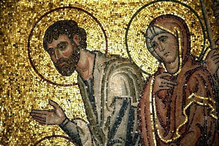 16. Мозаичная композиция в Дафни – одна из немногих икон, где очень хорошо читаются чувства родителей, отдающих чужим людям на воспитание единственного и долгожданного ребенка – навсегда. Да, Иоаким старается держаться, волнение выдают только руки. А вот Анна, кажется, еле сдерживает слезы…