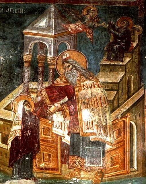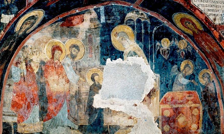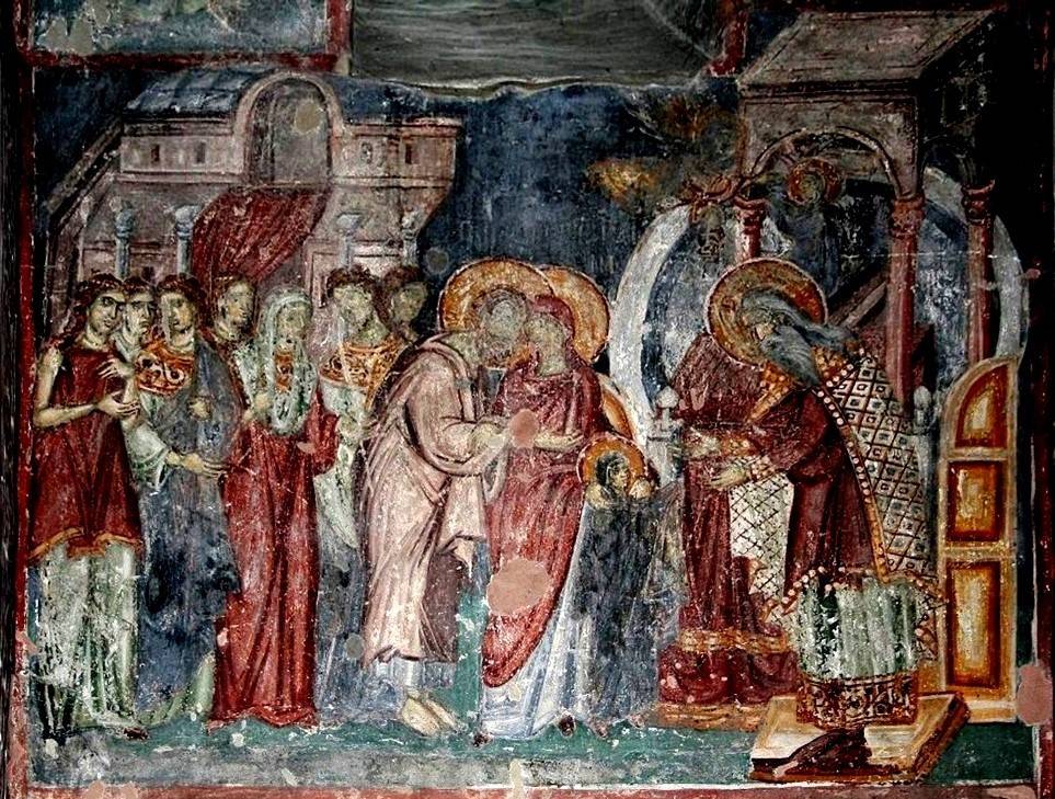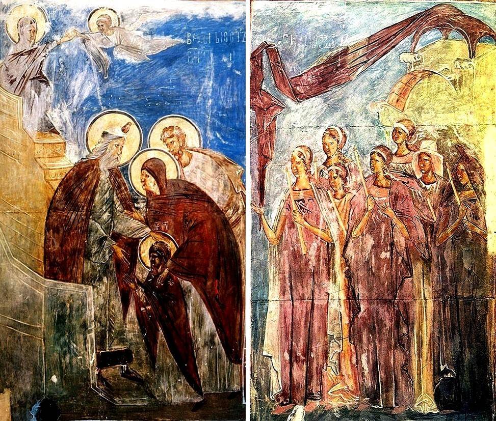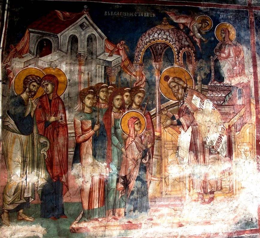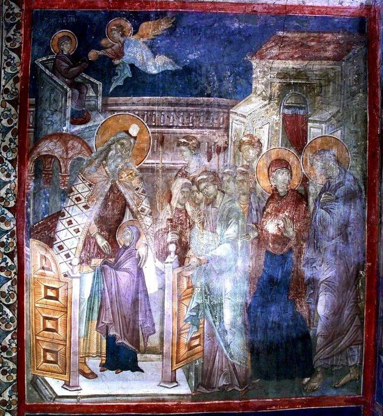 39-41. Написанная на несколько лет ранее уникальная композиция «Введение во Храм» кисти того же художника в церкви Иоакима и Анны («Кралевой») в сербском монастыре Студеница намного подробнее и имеет одну удивительную деталь: это очень своеобразно написанный двухъярусный кольцеобразный храм о семи столпах, отдельно от Храма Иерусалимского. И, хотя помещен он на втором плане, но в самом центре композиции, а потому невольно притягивает к себе взгляд молящихся.