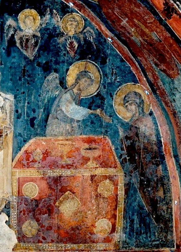 27, 28. В Боянской церкви (Болгария, роспись в нартексе XIV в.) ангел причащает Марию у некоего престола, напоминающего церковный престол того времени. Но что здесь имеется в виду – стол для хлебов предложения Иерусалимского Храма, Скиния с Ковчегом Завета, престол Небесной Литургии или – символически – все эти смыслы одновременно?