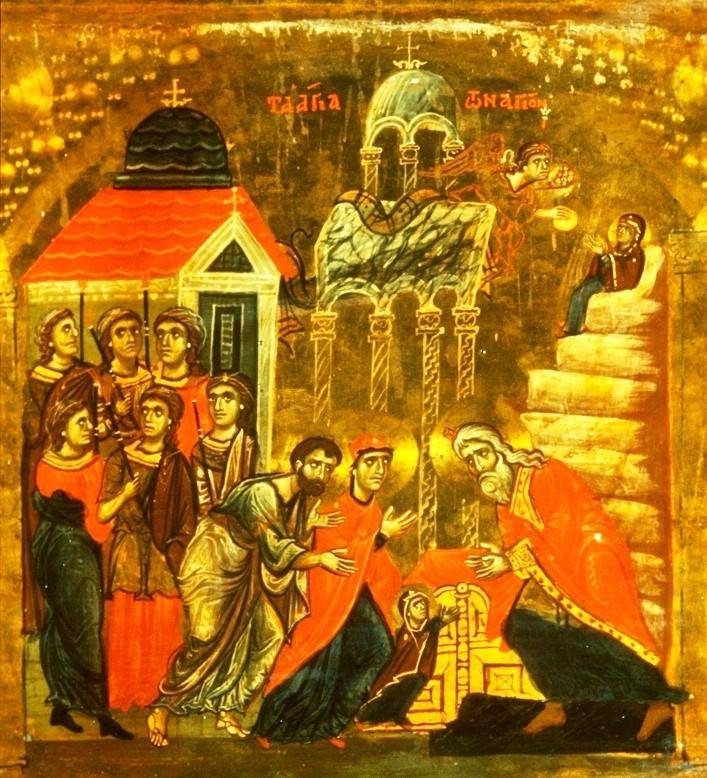 На иконе Введения в центре северной стены шествие, как обычно в храмах византийского мира, направлено в сторону жертвенника, расположенного слева от алтарной апсиды, где совершается Евхаристия – преложение хлеба и вина в Тело и Кровь Христовы – чтобы мы, Его ученики и последователи, Его усыновленные дети, приняли Его в себя, в свое тело и душу, и соделали свое тело Храмом Его во образ давшей Ему человеческое тело Пресвятой Его Матери, по слову Апостола: