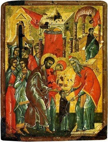 И это сопоставление не случайно: когда-то первосвященник не принял у Иоакима и Анны дары, думая, что они люди грешные, раз Бог не даровал им детей. Теперь тот же первосвященник (по преданию – Захария, будущий отец Иоанна Крестителя) принимает у них Дочь как чистый дар Богу, жертву – самое дорогое, что у них есть. Так, этот жест благочестивых родителей Приснодевы Марии можно понять как прообраз той Жертвы, которую принесет Сам Господь – Ее будущий Сын. Так же и служение Пресвятой Девы – жертвенное, ибо и Она отдает за жизнь мира самое дорогое – единственного Сына Своего. Встречает же Его в Храме другой святой старец – Симеон.