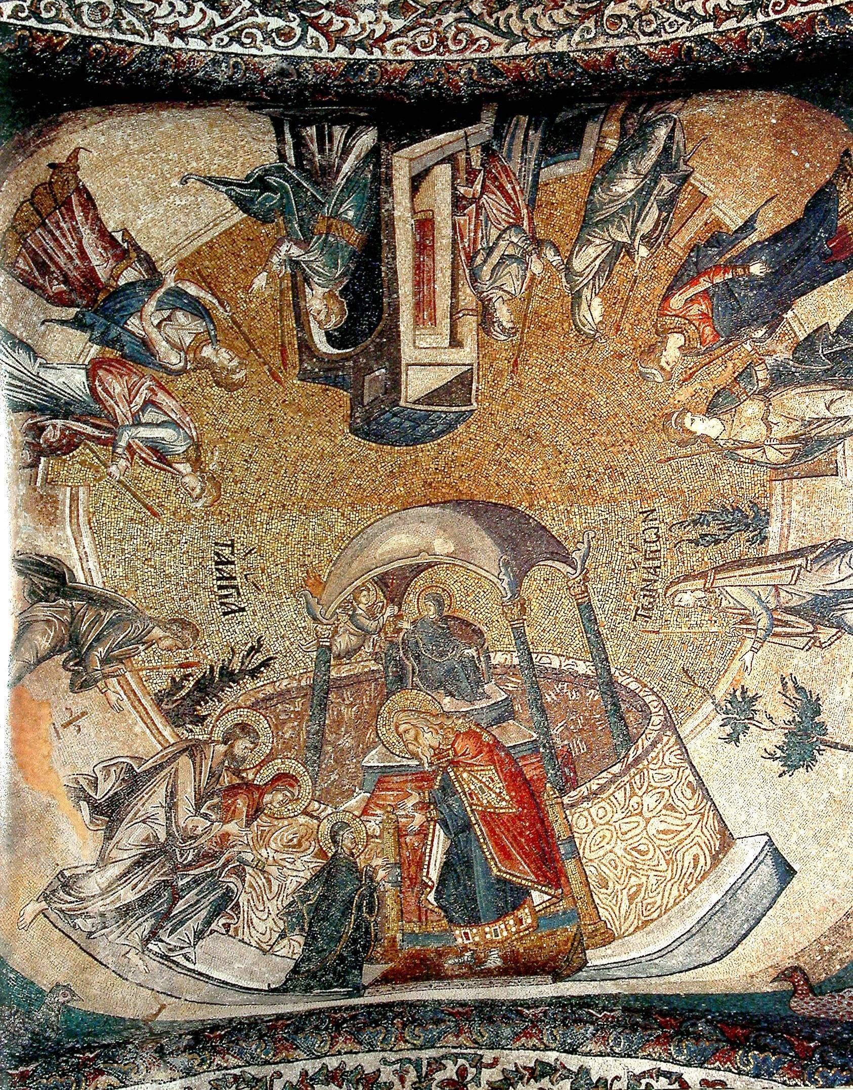 Плащ первосвященника украшен стилизованными буквами иудейского алфавита, из чего мы можем понять, что это человек Писания. Это довольно часто повторяющаяся на византийских фресках деталь.