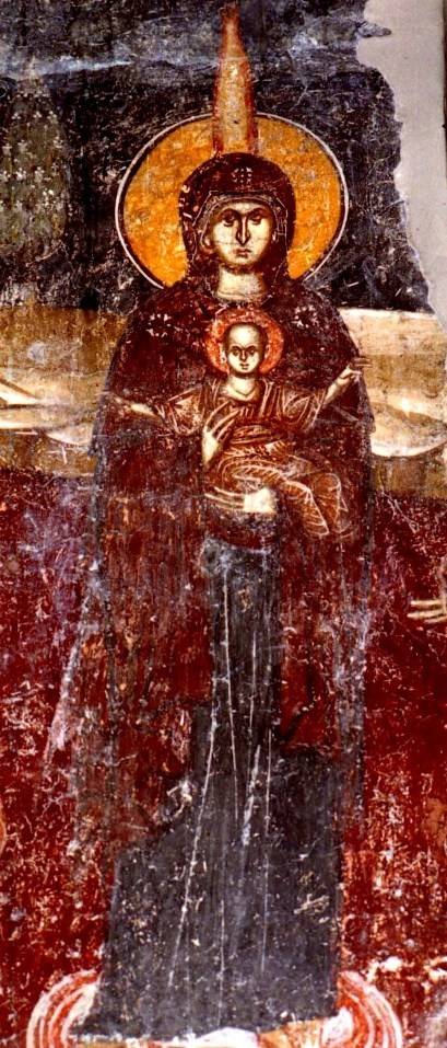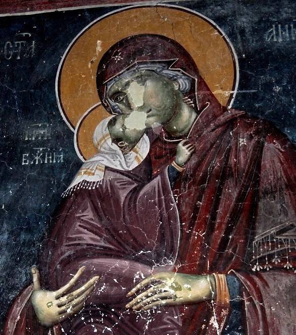 23. Нежный розовый платочек накинут на главу Приснодевы поверх еще более светлого мафория на фреске храма Пантократора в монастыре Высокие Дечаны (сер. XIV в., Сербия, Косово).