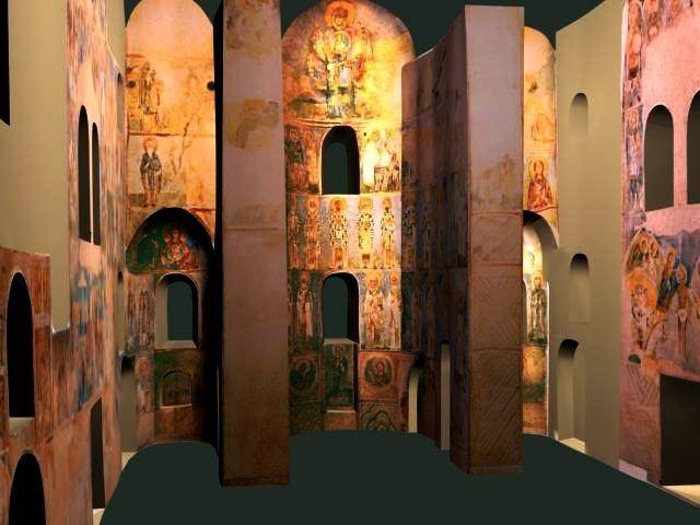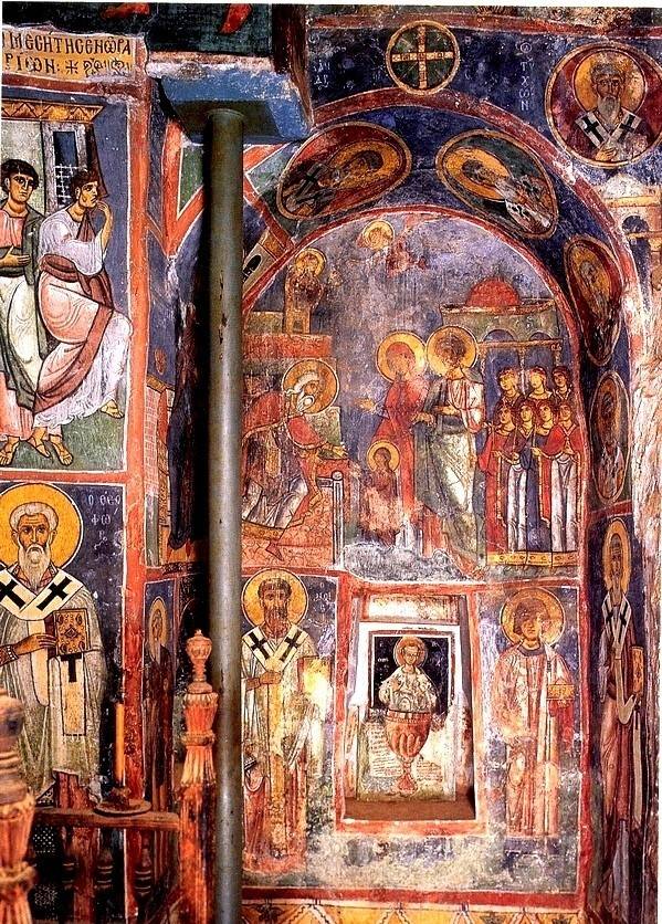 3. Фреска «Введение Богородицы во Храм» в соборе Св. Софии в Охриде (Македония, 1056 г., в это время епархия входила в состав Империи Ромеев) – одна из немногих сохранившихся сюжетных композиций, причем размещена она в малой апсиде – жертвеннике, где приуготовляются Св. Дары для приношения в алтаре. Уникальная богословская программа росписей храма составлена по плану святителя Льва Охридского; размещение сцен из земной жизни Богородицы в жертвеннике, возможно, по его почину, в дальнейшем вошло в традицию.