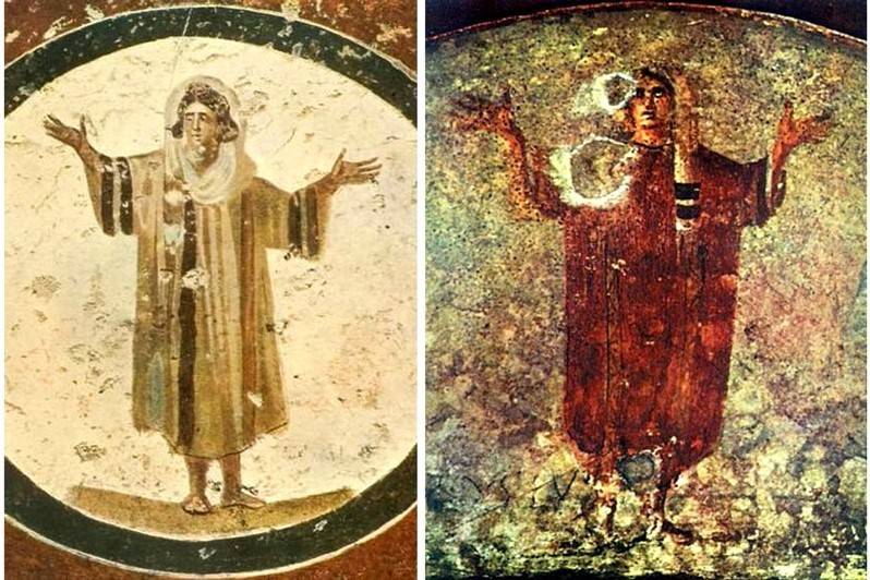10, 11. Изображения орант – погребенных здесь же женщин в молитвенных позах – в катакомбах Каллиста и Присциллы, III век.