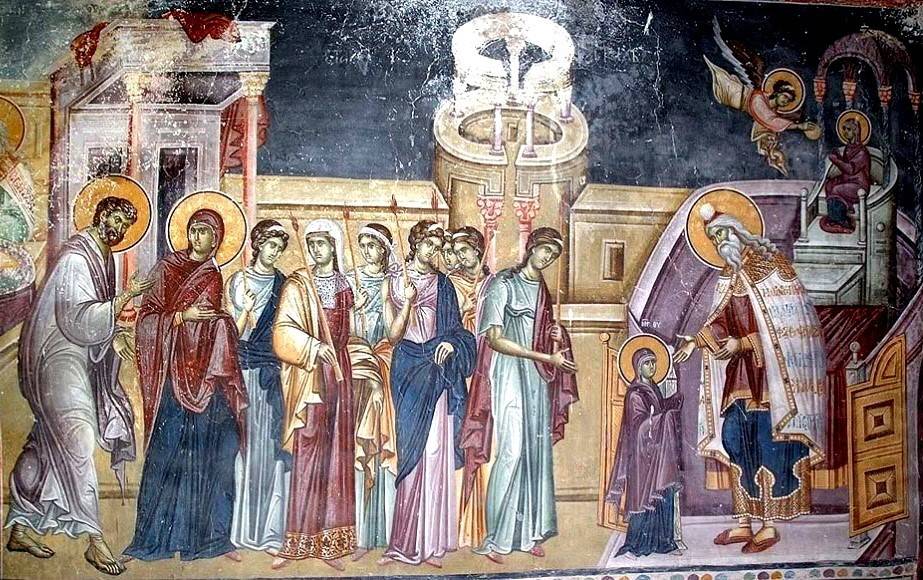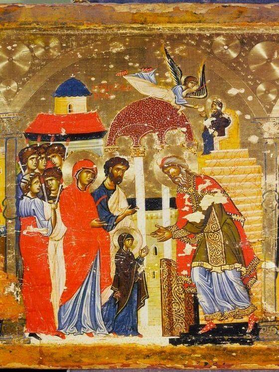 Из Храма выходит первосвященник Захария и склоняется навстречу маленькой Девочке. В росписях XI-XIII столетий во главе процессии вслед за Богородицей изображаются Ее святые родители, которые вручают свою Дочь священнику как дар, обещанный Богу, а за Иоакимом и Анной идут девы с горящими свечами в руках; с XIV века родители, как правило, изображаются в конце процессии дев. Мария из них – самая маленькая. Но интересно то, что Она изображается в обычном Своем одеянии замужней женщины на Востоке – с покрытой головой синим или вишневым мафорием. При том, что сопровождающие Ее девы – не сказать, что простоволосые, но их волосы уложены так, как принято изображать ангелов, – с развевающимися лентами в кудрявых волосах. Может быть, здесь есть намек на мысль о том, что ангелы не только питали Марию в храме, но и сопровождали Ее на пути к Храму. Во всяком случае, эта деталь очень устойчива и повторяется практически на всех иконах праздника; вспомним – такие же девы-ангелы обступают ложе Анны и стоят у колыбели Новорожденной Марии на иконах «Рождество Богородицы» – то есть ангелы сопровождают Марию с самого Ее Рождества – зримо или незримо.