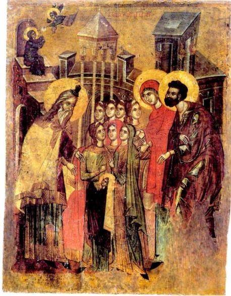 Обратим внимание: здесь также некоторые из сопровождающих Марию дев имеют белые платы диаконисс на голове, в том числе та, которая непосредственно подводит Девочку к первосвященнику.