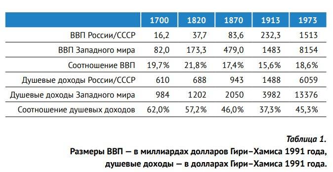 Так, например, с 1600 по 1913 год доля России в населении Земли выросла с 3,7% до 8,7% (здесь и в трёх следующих сравнениях Россия рассматривается в имперских границах 1913 года, а Запад — в границах современной Западной Европы, Северной Америки и Австралии), то есть почти в два с половиной раза, в то время как доля «коллективного Запада» только с 13,3% до 20,8%, всего в полтора раза. И это — несмотря на заселение западными людьми суперпродуктивных восточных и центральных Штатов! За этот же период подушевой ВВП в России увеличился менее чем втрое, с 552 до 1488 долларов (условные доллары Гири–Хамиса 1991 года, данные из сборника А. Мэдиссон «Контуры мировой экономики в 1–2030 гг.»), в то время как душевые доходы обитателей Западной цивилизации увеличились почти впятеро, с 870 до 3986 долларов.