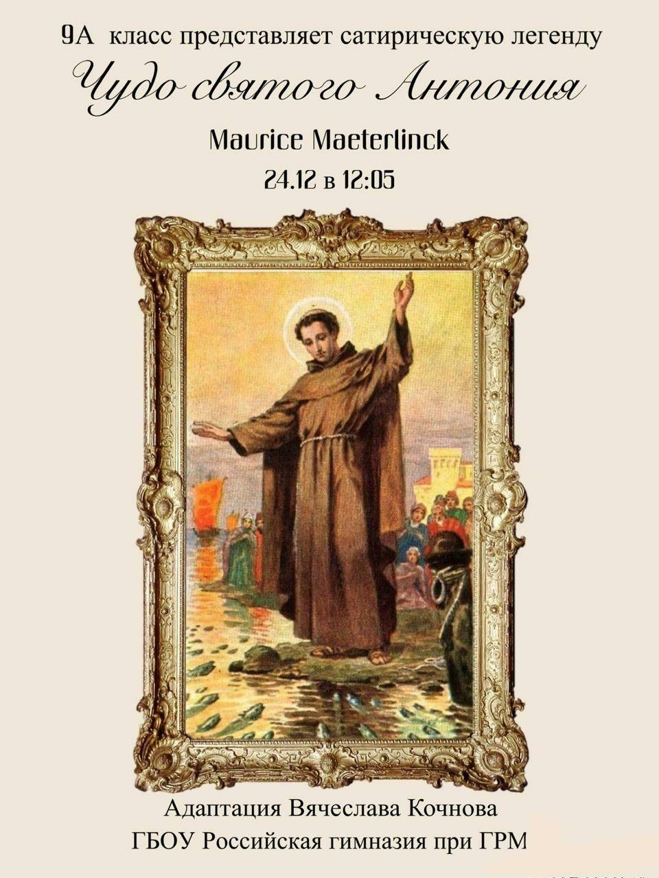 Вячеслав КОЧНОВ. Несмотря на очевидную востребованность у людей Серебряного века, Мэтэрлинк забыт практически весь, за исключением «Синей птицы». «Чудо святого Антония» сейчас, слава Богу, идёт в Москве в «Современнике» и в «Новом драматическом театре», а вот в Санкт-Петербурге после постановки Мейерхольда 1906 года, то есть уже 120-летней давности, по моим сведениям, к «сатирической легенде» Мэтэрлинка городские театры не обращались: во всяком случае, сведений об этом в интернете и у живых театроведов я не нашел. Чтобы пьеса была доступней и учащимся, и современному зрителю, я ее немного сократил и адаптировал: привнес названия петербургских улиц и некоторые современные реалии, бережно сохранив имена персонажей драмы из величайшего уважения и любви к ее автору.