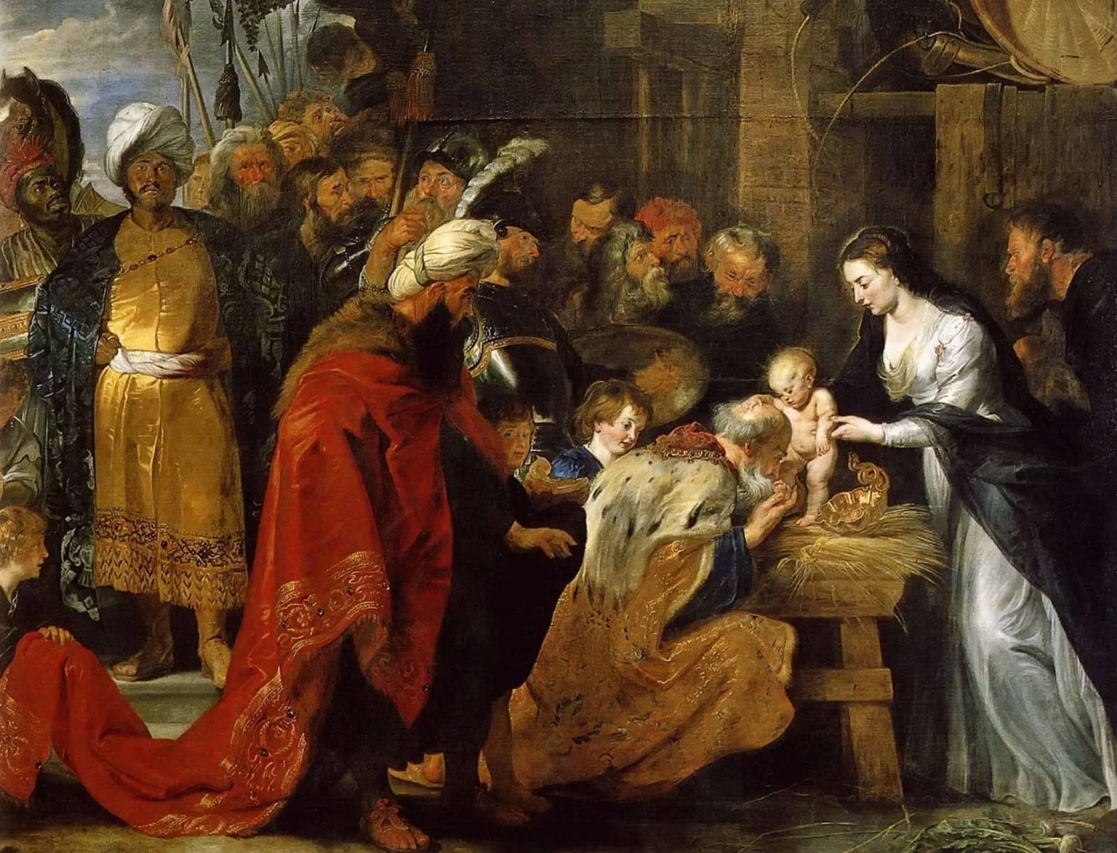 У Рубенса – признанного мастера фламандского барокко – на его исполинском – 3,5 на 5 метров полотне всё изображается уже до такой степени обмирщено, что опасаешься, как бы херувимчики, пардон, ангелочки, не рухнули вниз подобно Деснице, и не придавили бы своими телесами кого-то из свиты. Немудрено, что как раз подобные картины и сформировали в православной (и, кстати, протестантской) среде негативное отношение к превращению живописи на библейские темы во что-то из разряда «развлекательного искусства на мифологическую тему». Речь идёт о «Поклонении волхвов», написанном в 1609 г. и хранящемся ныне в музее Прадо в Мадриде.