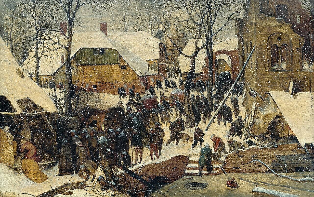 Питер Брейгель Старший переносит Рождество Христово во фламандский городок. Мы видим толчею коренастых мужичков на улочке, кто-то аж скрючился, так страдает от холода… Все чем-то заняты: тот пилит дерево, те черпают воду из проруби, иные не просто не обращая ни малейшего внимания на осликов из свиты волхвов, но, кажется, будто отталкивают этих нарядных животных…