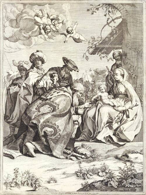 В принципе, композиция была найдена ещё Паоло Веронезе: Богородица с Младенцем находятся в точке пересечения диагоналей, одна из которых образована группой волхвов со свитой, а другая – святым Семейством.