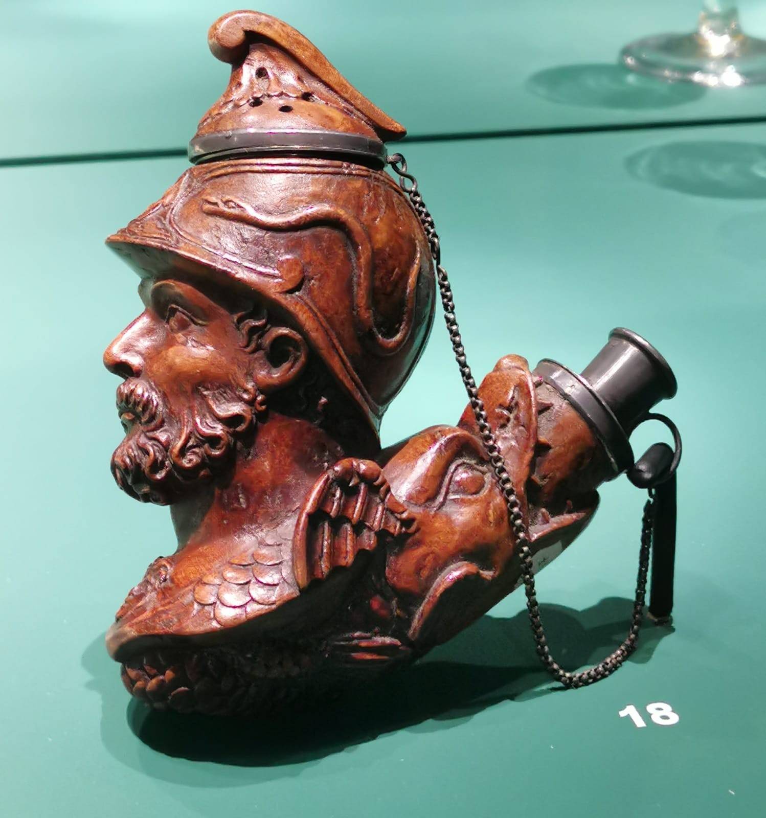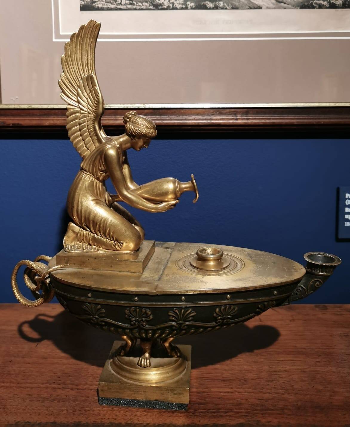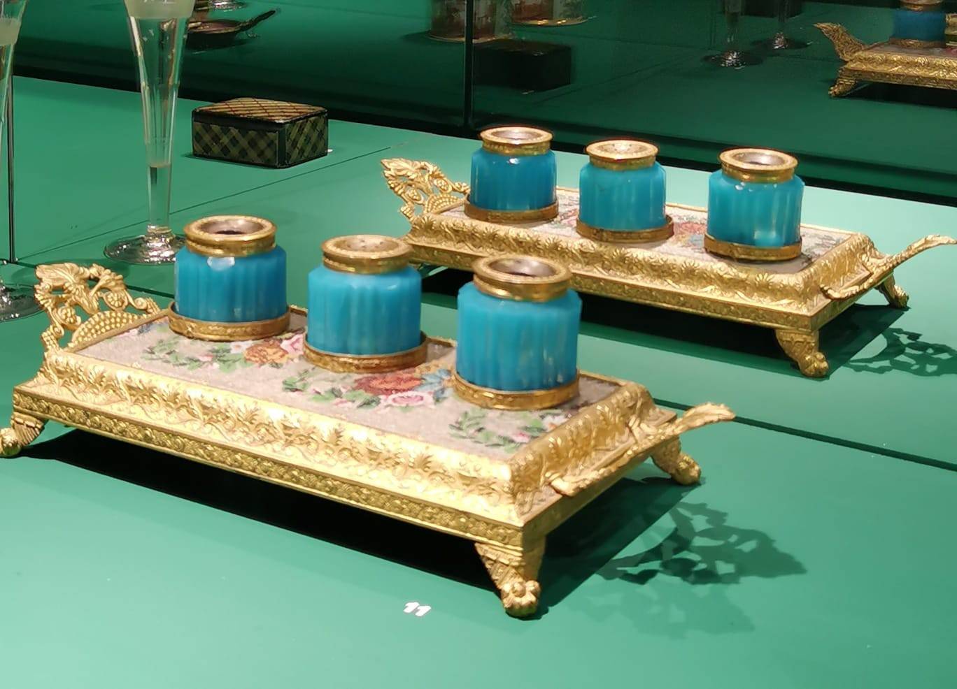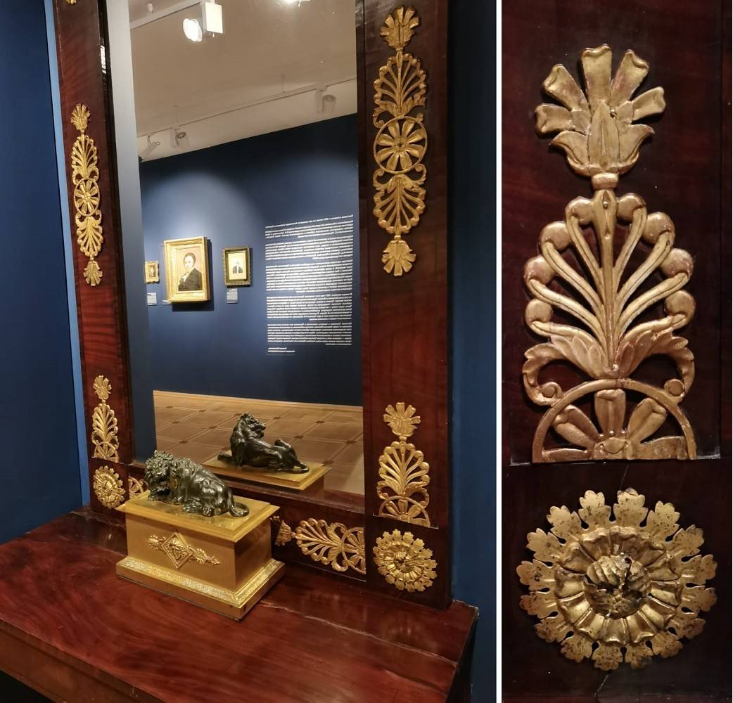 Экспозицию дополняют предметы быта: зеркало в стиле ампир с характерным декором в виде пальметт, роскошное пианино, масляные лампы и подсвечники, высокие бокалы, из которых тогда пили шампанское, разнообразные чернильницы – иные из них декоративно оформлены фарфоровыми розами, курительная трубка в виде головы античного воина – греко-римская эстетика проникала всюду. Эта выставка значительно расширяет наше понимание пушкинского времени – через лица, вещи и маршруты.