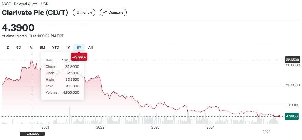 Итак, WoS находится в собственности Clarivate, зарегистрированной по английскому праву со штаб-квартирой в Лондоне. Clarivate ранее являлась подразделением известнейшего медиаагентства Thomson Reuters, но в 2016 году была продана частным инвесторам и теперь торгуется на Нью-Йоркской фондовой бирже под символом CLTV. Торгуются акции Clarivate скверно: в январе 2019 года стоили 9,5 долл., затем, в сентябре 2020 года, поднимались аж до 32,2 долл., к сентябрю 2022-го упали снова до 9 долл., а в марте 2025 года торгуются по 4,3 долл.
