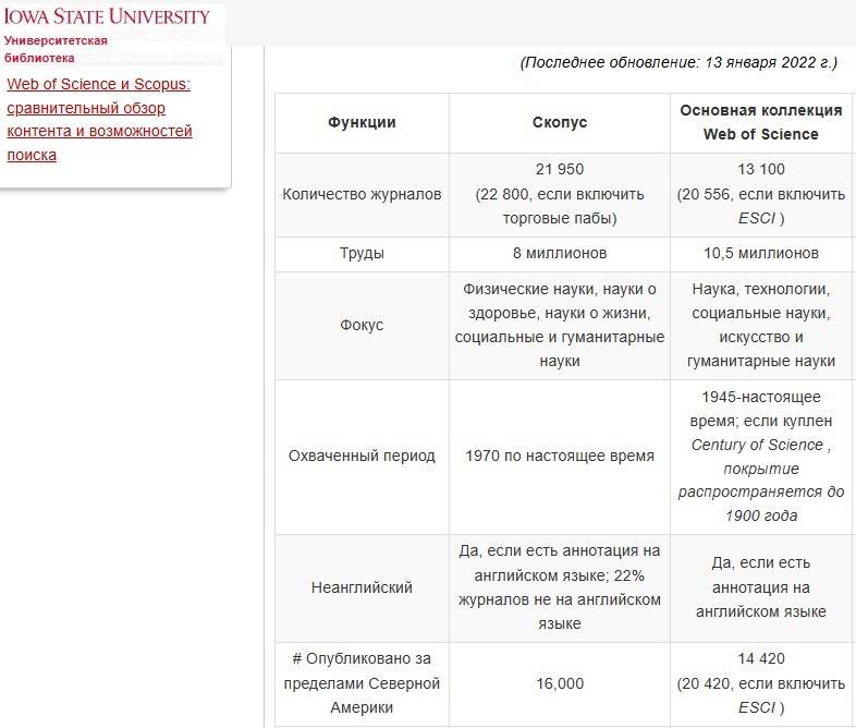 Многочисленные источники, сравнивающие две наукометрические базы данных, пишут, что те пересекаются на 80–90% по составу журналов и очень похожи по их количеству. Журналов индексируется у Scopus 22,8 тыс., у WoS — 20,6 тыс., статей 8 млн и 10,5 млн соответственно, с разницей из-за годов охвата (с 1970-го и 1945-го соответственно).