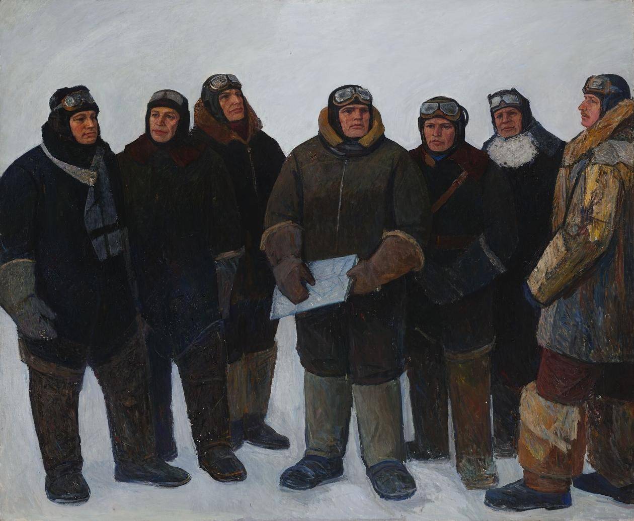 Те быстрые эскизы Решетников использовал через сорок лет, когда разрабатывал живописный цикл - рассказ о челюскинцах и их спасителях. На выставке можно увидеть эпохальное полотно «Первые герои», написанное в 1970-х годах. Это – коллективный портрет, где изображены первые Герои Советского Союза - Анатолий Ляпидевский, Василий Молоков, Сигизмунд Леваневский, Михаил. Водопьянов, Николай Каманин, Иван Доронин и Маврикий Слепнев. Когда-то эти фамилии гремели, их знали все – от профессоров до уголовников, от пионеров – до ветхих стариков, помнивших ещё царствование Александра II. Полярные полубоги — вот были настоящие звёзды и народные кумиры.