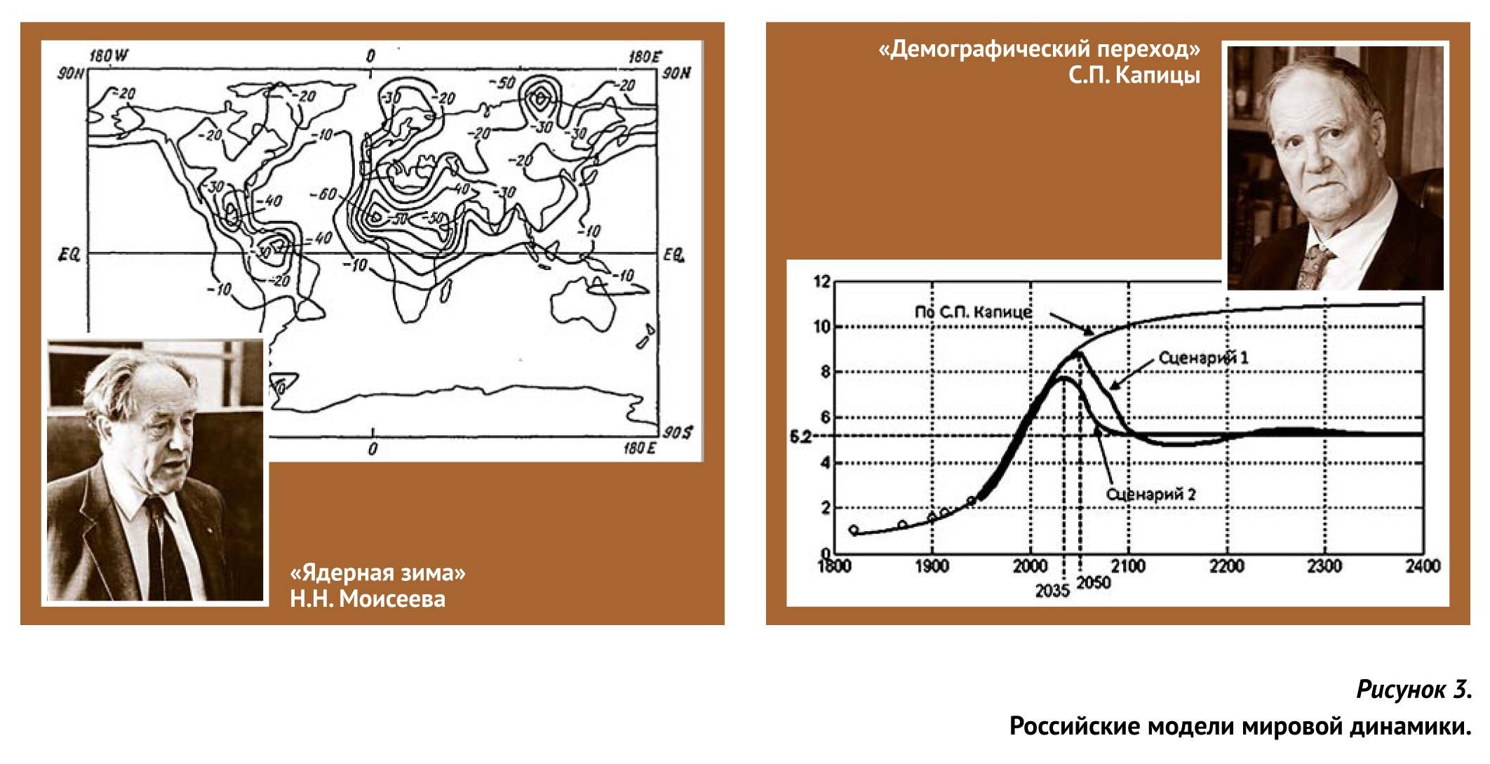 Уже в 1980‑е годы механистическим моделям были противопоставлены другие решения, основанные на принципах нелинейности. Среди них модели «ядерной зимы» Н.Н. Моисеева и «демографического перехода» С.П. Капицы. Последняя доказывала естественный характер снижения темпов роста населения Земли, отменив «геометрический закон» Мальтуса (рис. 3).