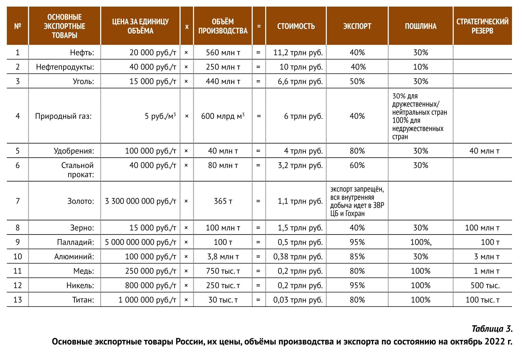 Внутренние базовые цены формируют народно-хозяйственные пропорции и задают спрос на рубль на внешнем рынке. Приведём в таблице 3 ряд условных расчётов, которые показывают феноменальные возможности развития страны. (Они включают основные экспортные товары России, их цены, объёмы производства и экспорта по состоянию на октябрь 2022 г.)