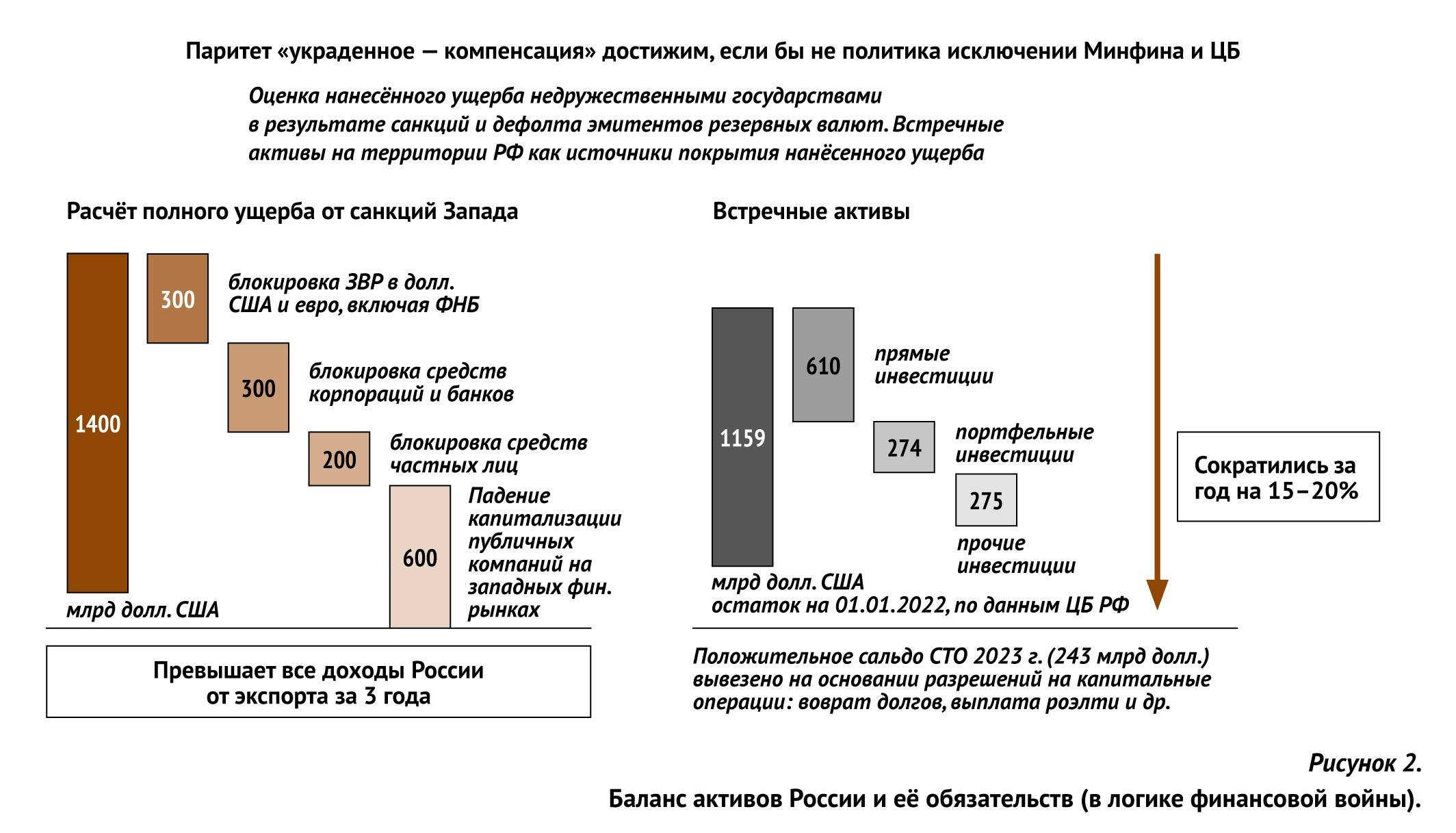 Избавления внутри страны от вассальной «картины мира» (онтологии) и алгоритмов деятельности на её основе (экономической, технологической и социальной политики) недостаточно для достижения целей развития. Россия слишком значима для мировой экономики, как и мировой рынок для наших важнейших отраслей, чтобы автаркизм был успешен. Жизненно важный интерес России выражен неоднократно высшими лицами — справедливое международное сотрудничество и равная безопасность. В текущих исторических условиях справедливость в международном экономическом сотрудничестве означает предельно конкретные задачи: во‑первых, прекращение дотирования западной экономической системы, происходящее в форме оттока российского капитала. Вовторых, восстановление прав России на собственные блокированные финансовые средства в западных финансовых структурах, что по факту было актом финансовой войны и является актом незаконной экспроприации активов российского государства, предприятий и частных лиц.
